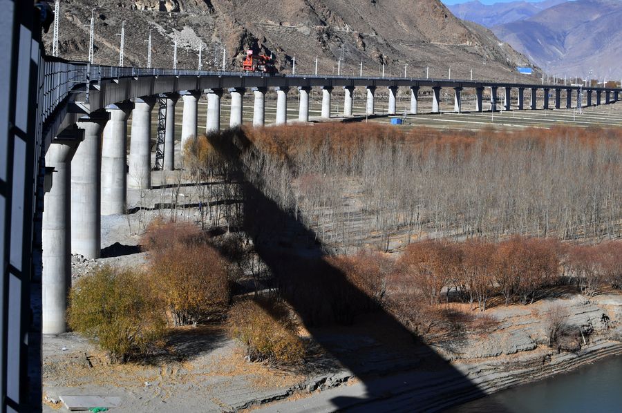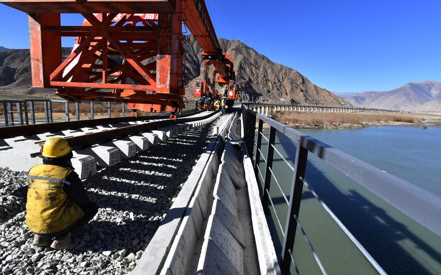 LHASA, Dec. 2, 2019 (Xinhua) -- The rail-laying work of a 4,615-meter-long bridge crossing the Yarlung Zangbo River of Lhasa-Nyingchi railway in Sangri County of southwest China's Tibet was completed on Sunday.