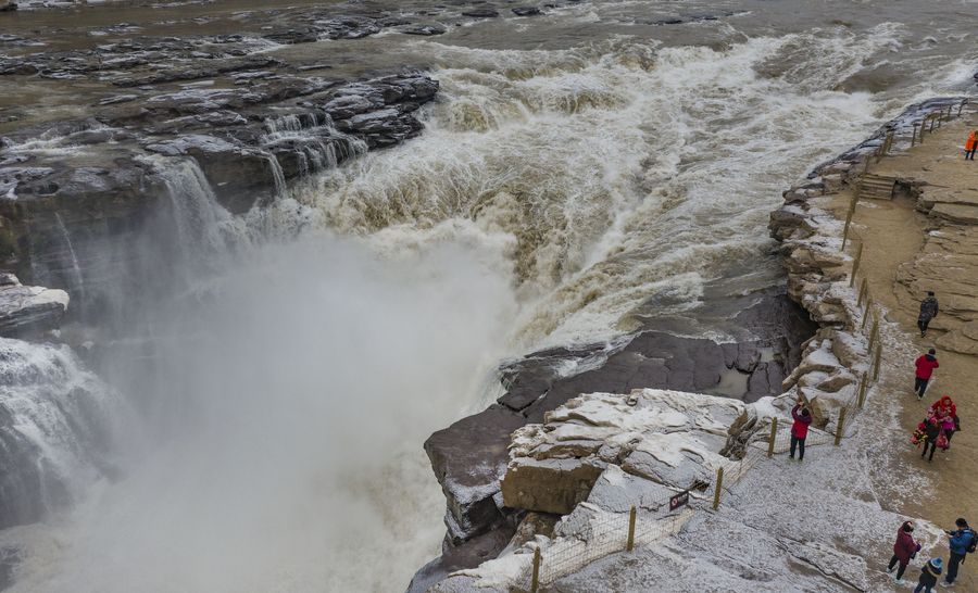 Tourists take photos at the Hukou Waterfall scenic spot, Dec. 14, 2019. (Xinhua/Tao Ming)