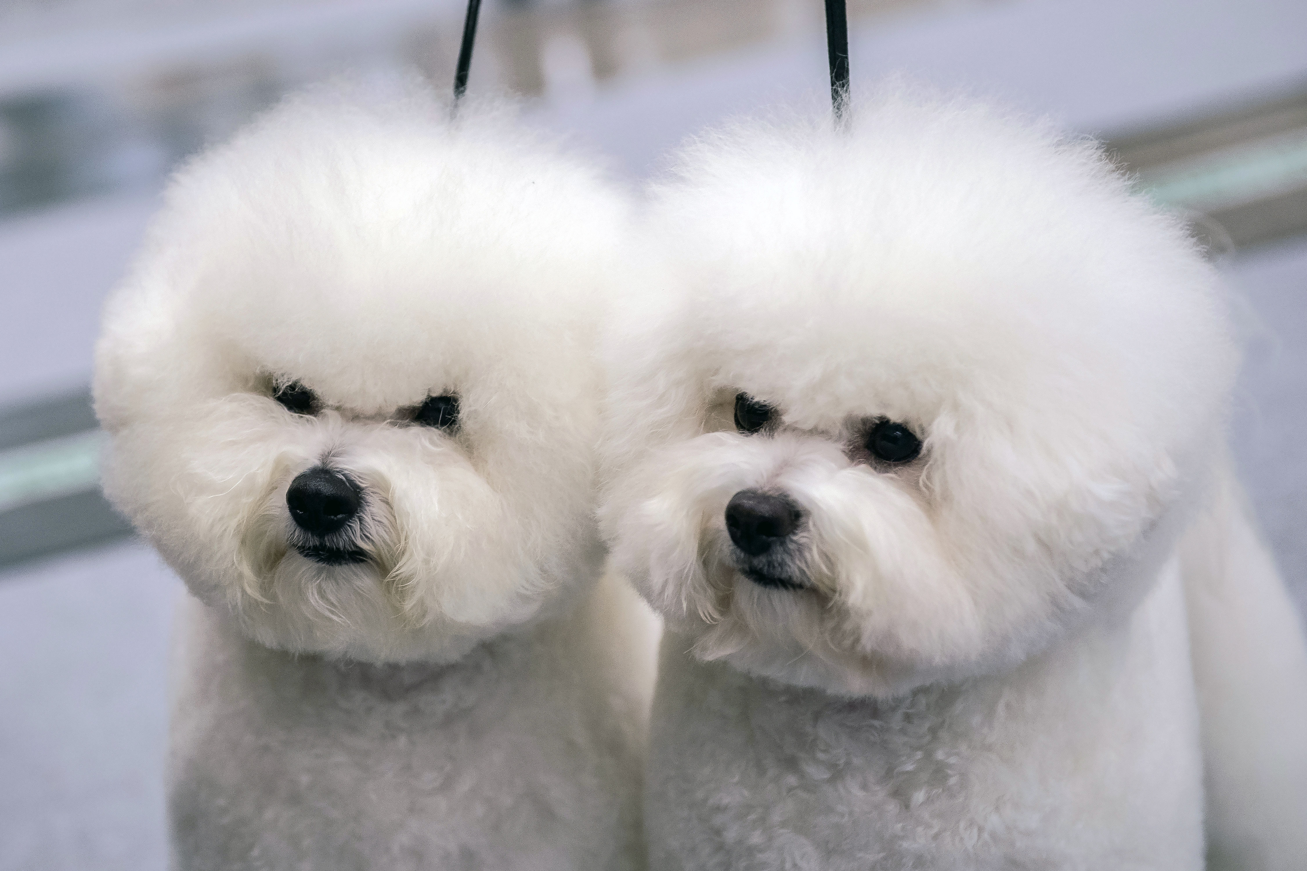 Two Maltese dogs are seen at an international dog show in Vilnius, Lithuania, Dec. 21, 2019. Around 2,000 dogs from European and other countries were presented in the event lasting from Dec. 20 to Dec. 22. (Photo by Alfredas Pliadis/Xinhua)