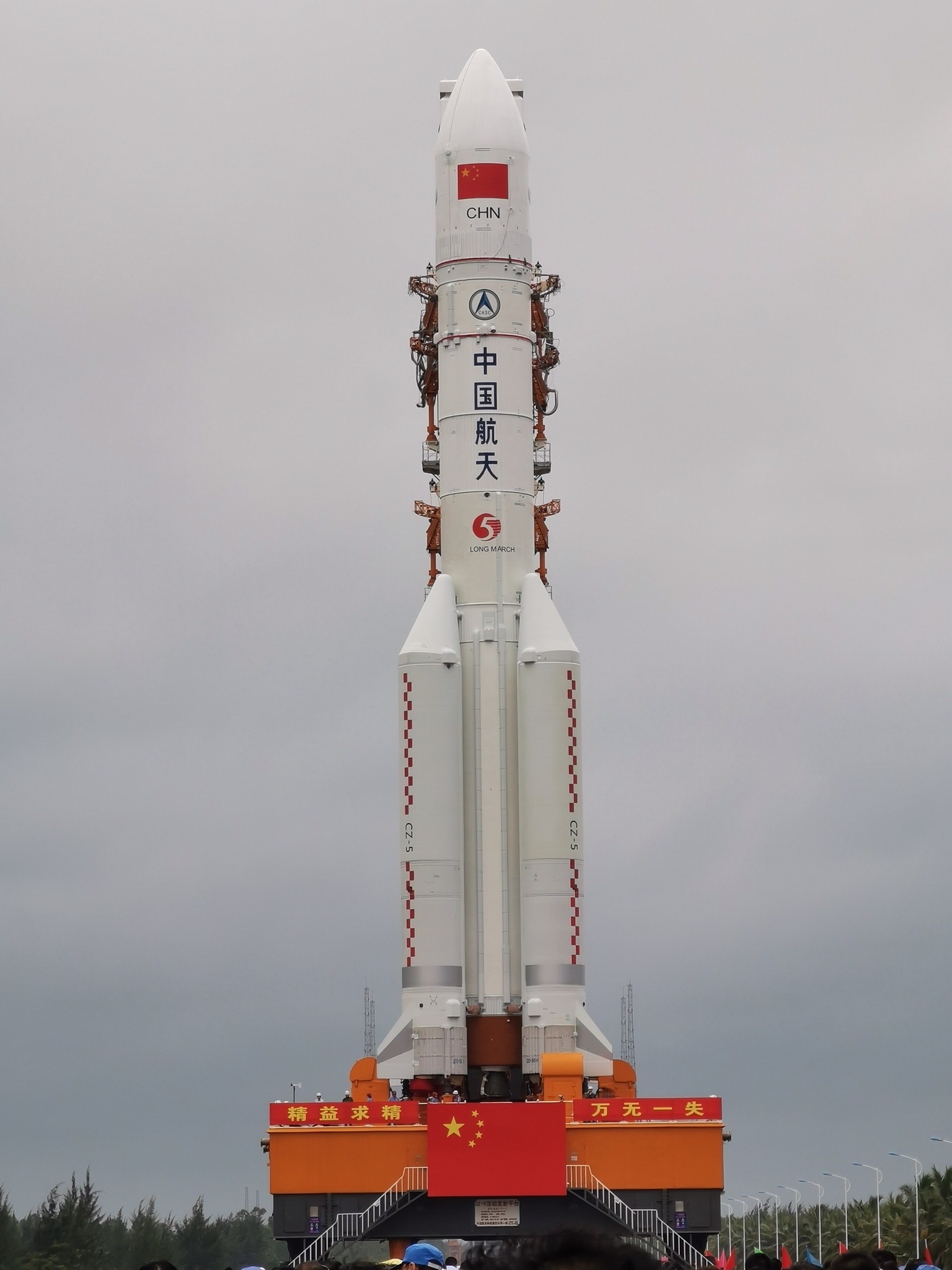 The third Long March-5 rocket, China's largest carrier rocket, was vertically transported to the launching area at the Wenchang Space Launch Center in south China's Hainan Province on Saturday.