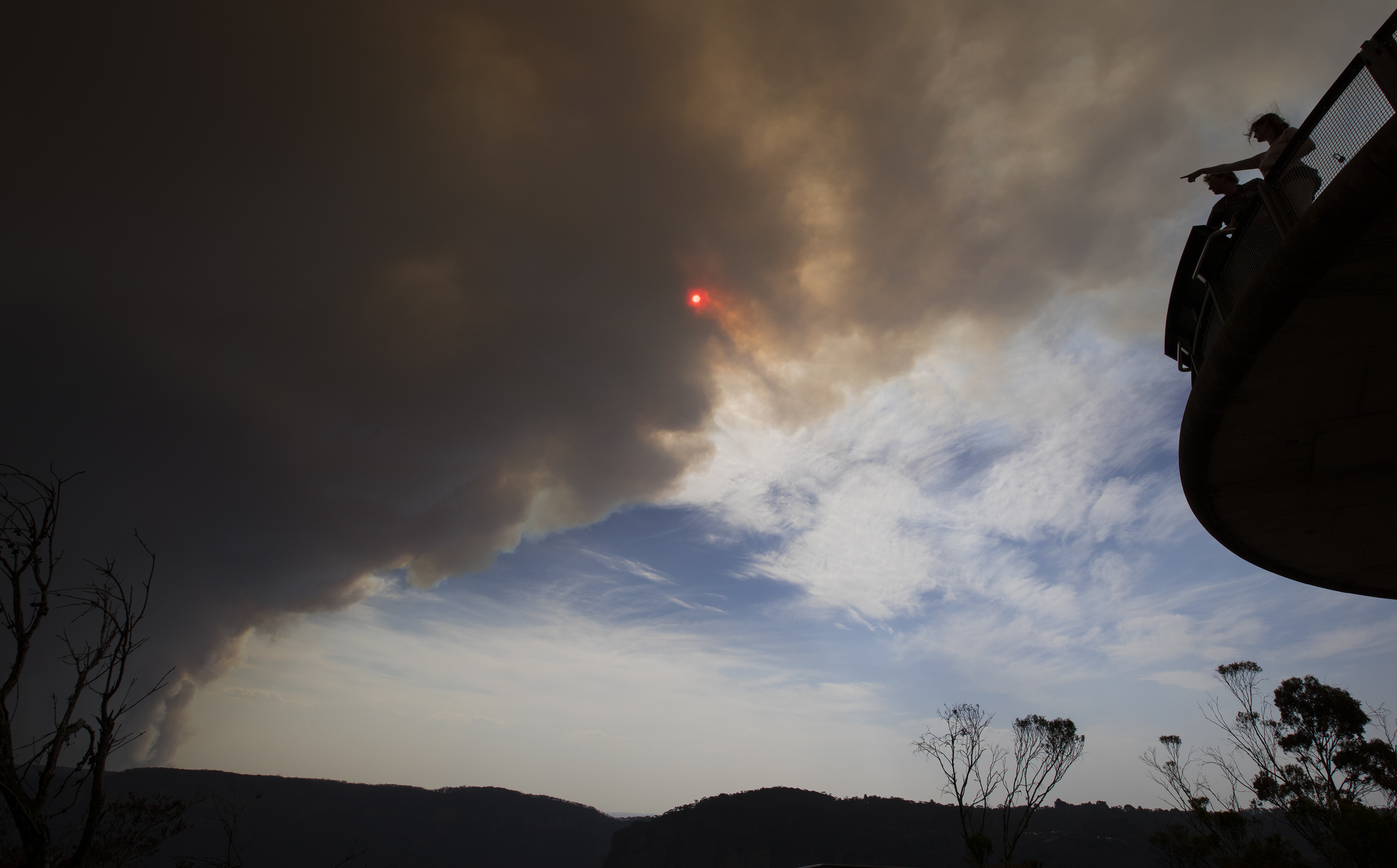 Citizens observe the condition of the bushfire in the smoke-shrouded Blue Mountain area, New South Wales, Australia, Dec. 21, 2019. The New South Wales (NSW) government in Australia once again declared a state of emergency because of the devastating bushfire on Thursday. (Xinhua/Bai Xuefei)
