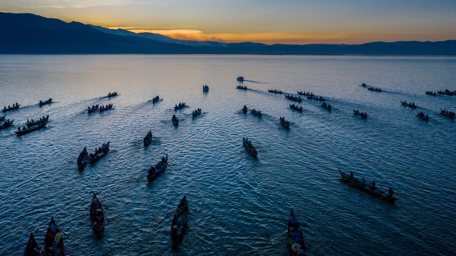 Aerial photo taken on Dec. 25, 2019 shows fishing boats sailing on the Xingyun Lake in Yuxi, southwest China's Yunnan Province. A fishing ban on the Xingyun Lake was lifted on Wednesday. The fishing season will last till Jan. 23, 2020. (Xinhua/Hu Chao)