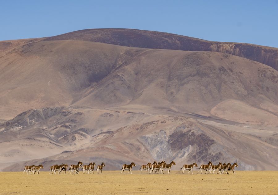 Tibetan wild donkeys run in Nagqu, southwest China's Tibet Autonomous Region, Dec. 23, 2019. The number of wild animals in Nagqu rises gradually thanks to the improvement of the ecological environment. (Xinhua/Sun Fei)