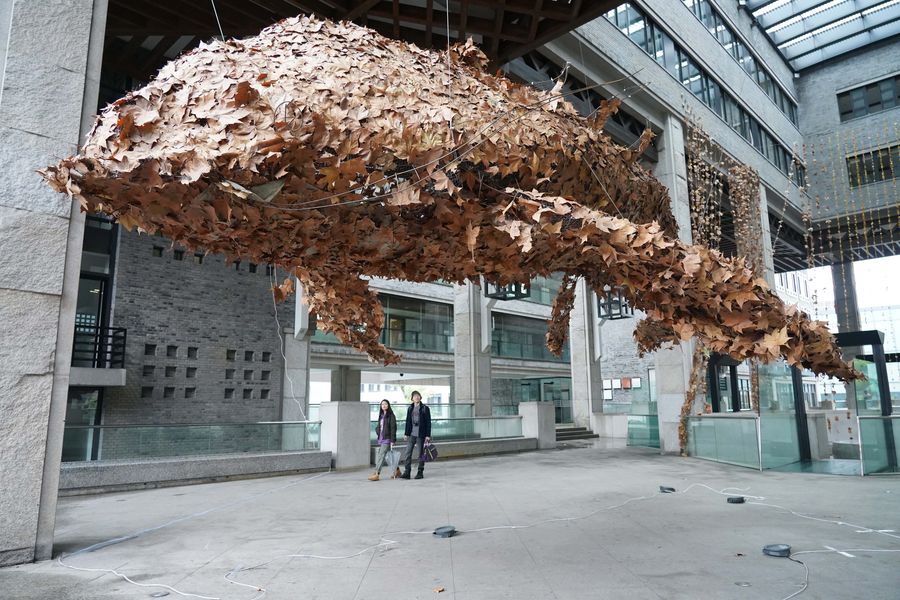 Local residents look at an artwork made of autumn leaves in an exhibition in Hangzhou, east China's Zhejiang Province, Dec. 24, 2019. The 3rd autumn leaves art exhibition opened here to present a visual feast for visitors. (Photo by Zhao Fanyu/Xinhua)