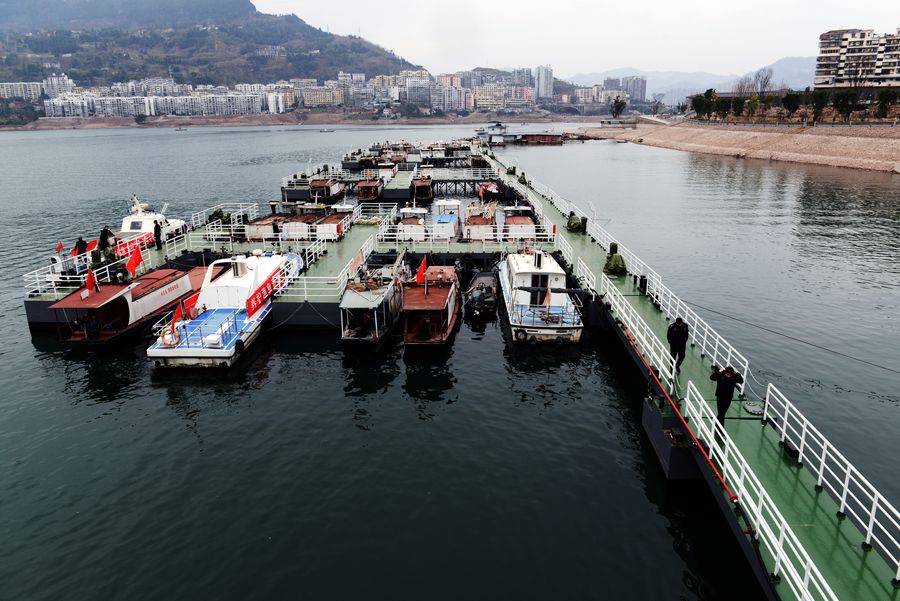 Fishing boats are anchored at a quay on the Pengxi River, a Yangtze River tributary, in Yunyang County, southwest China's Chongqing Municipality, March 1, 2019. (Xinhua/Xie Hong)