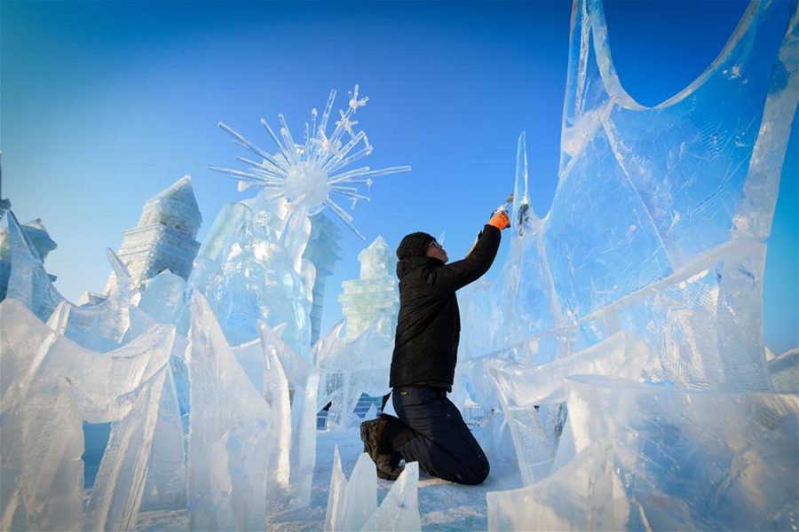 A sculptor takes part in the 9th China Harbin International Ice-Assemblage Championship in Harbin, northeast China's Heilongjiang Province, Jan. 3, 2020. (Xinhua/Wang Song)