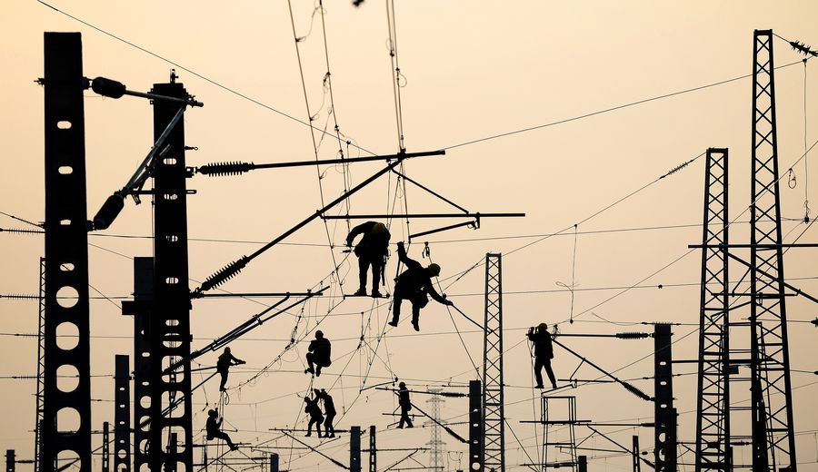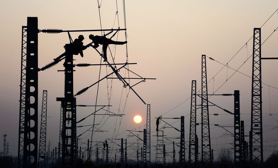 Electricians set the electric system for a railway line linking Xinfeng and Yaocun in Xi'an, capital of northwest China's Shaanxi Province, Jan. 7, 2020. (Xinhua/Liu Xiao)