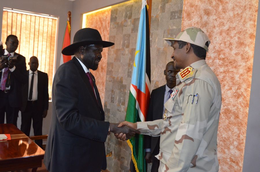 South Sudanese President Salva Kiir (L, front) shakes hands with Mohamed Hamdan Daqlu, Deputy Chairman of Sudan's Sovereign Council in Juba, capital of South Sudan, Dec. 10, 2019. (Xinhua/Denis Elamu)