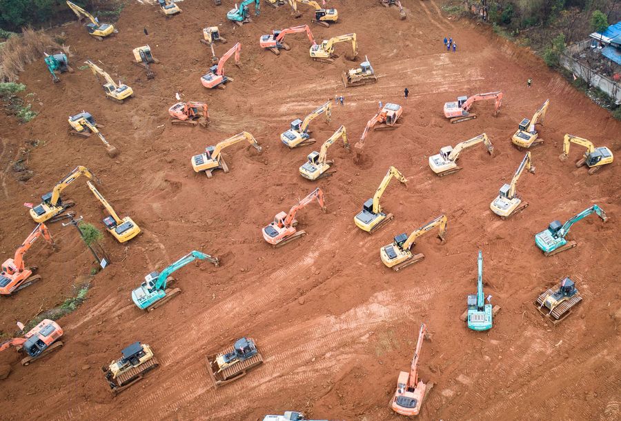 Aerial photo taken on Jan. 24, 2020 shows mechanical equipment working at the construction site of a special hospital in the Caidian District of western suburb of Wuhan, central China's Hubei Province. The central China metropolitan of Wuhan will follow Beijing's SARS treatment model to build a special hospital for admitting patients infected in the outbreak of pneumonia caused by the novel coronavirus.