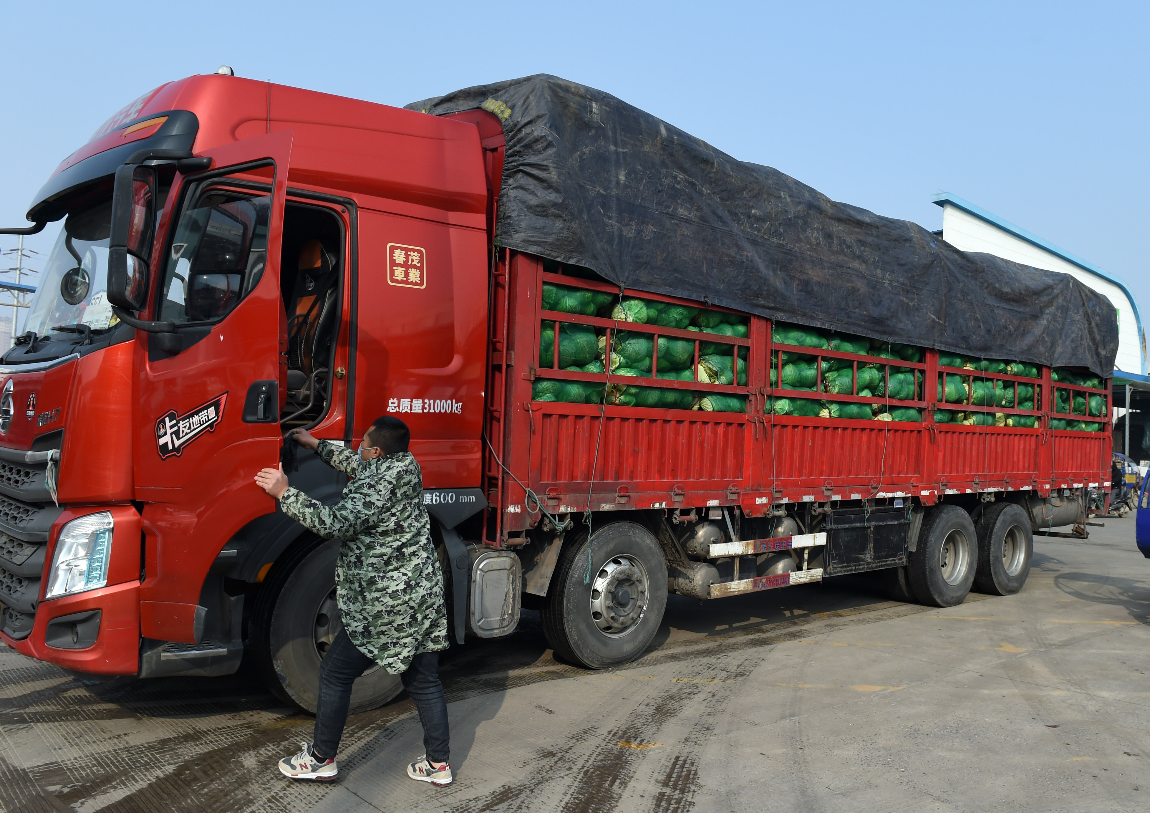 A driver stands next to a truck full of fresh vegetables at a trading center in Hefei, east China's Anhui Province, Jan. 30, 2020. (Xinhua/Zhou Mu)