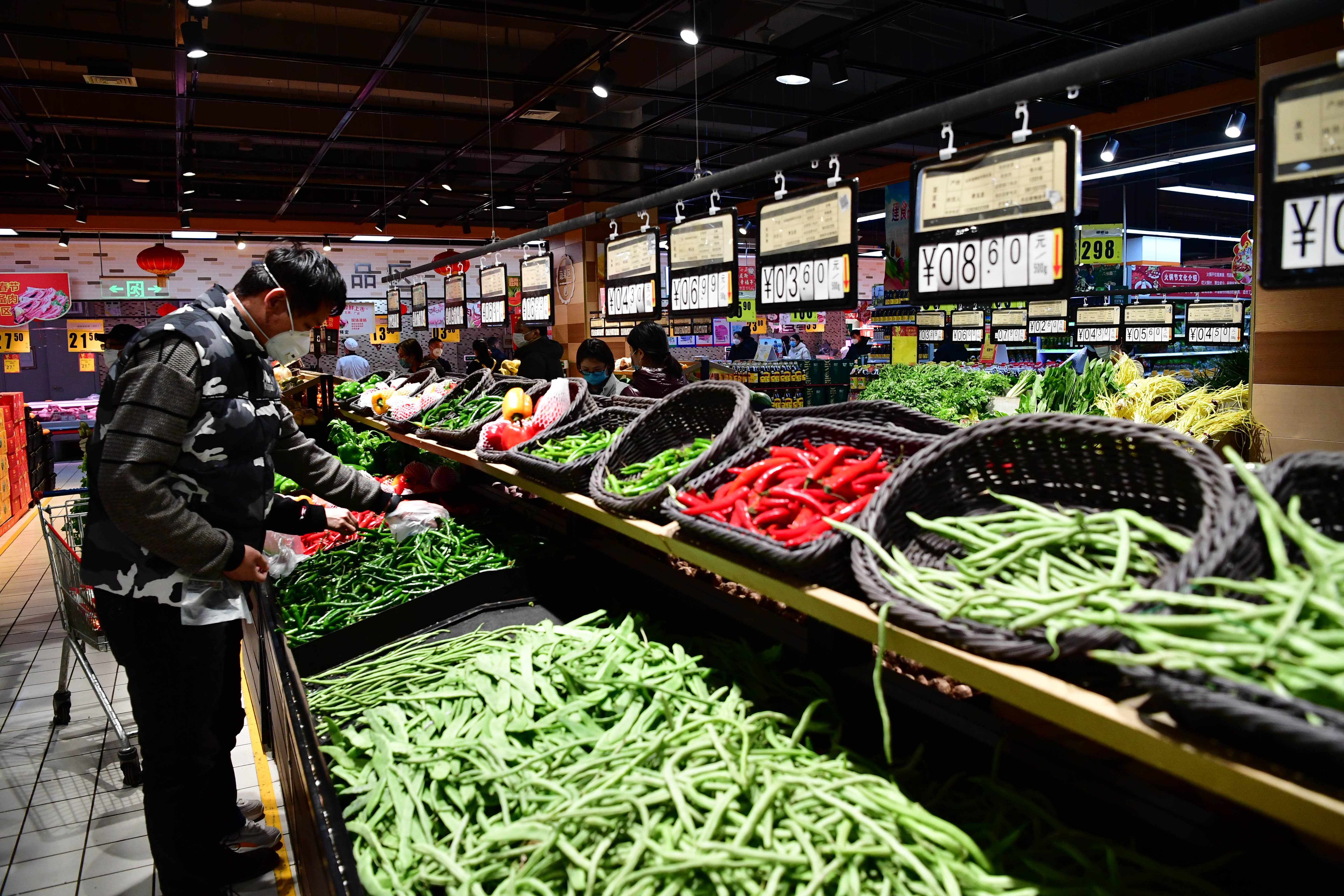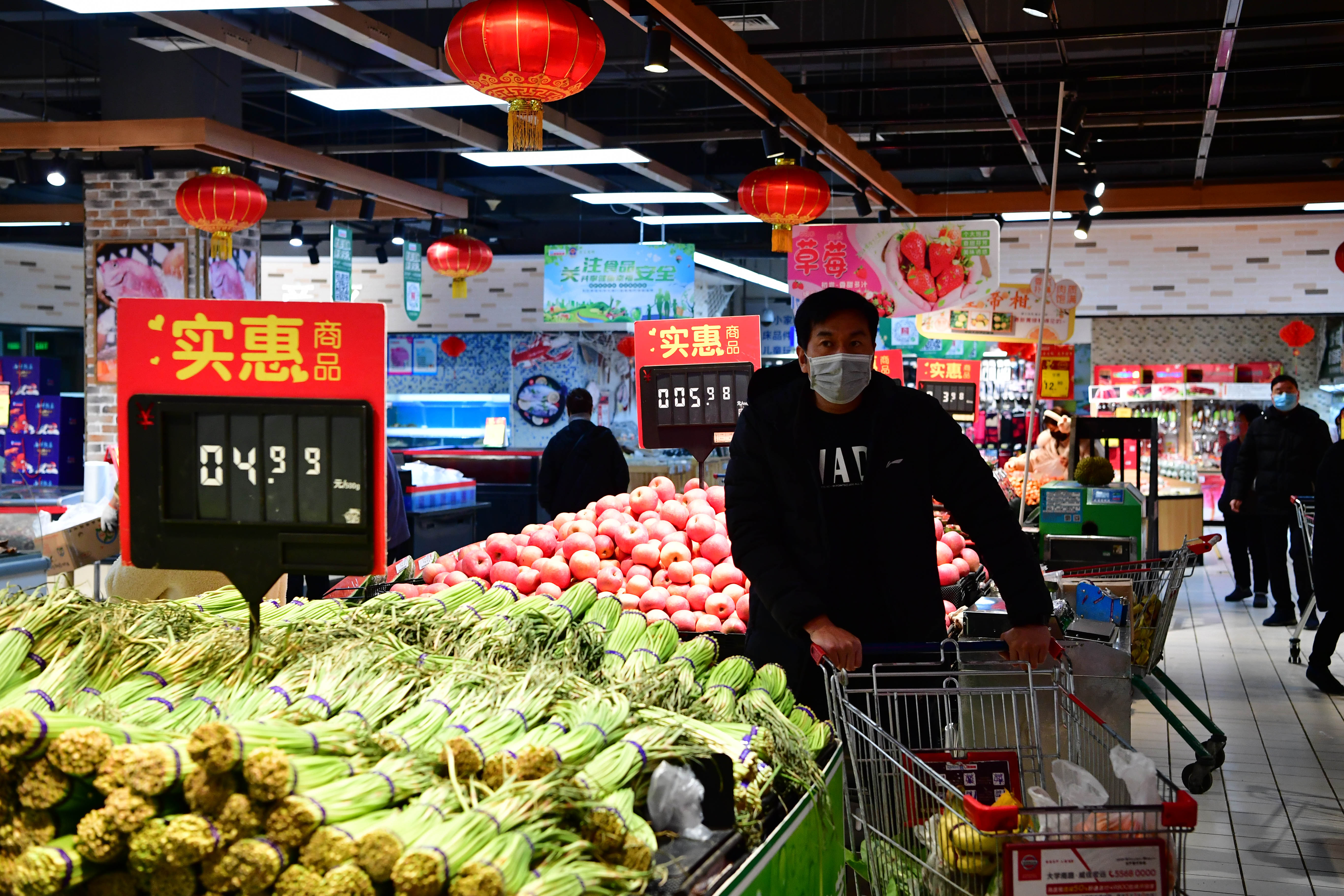 A staff member weighs vegetables for a customer at a supermarket in Qingshanhu District of Nanchang, east China's Jiangxi Province, Jan. 30, 2020. (Xinhua/Hu Chenhuan)