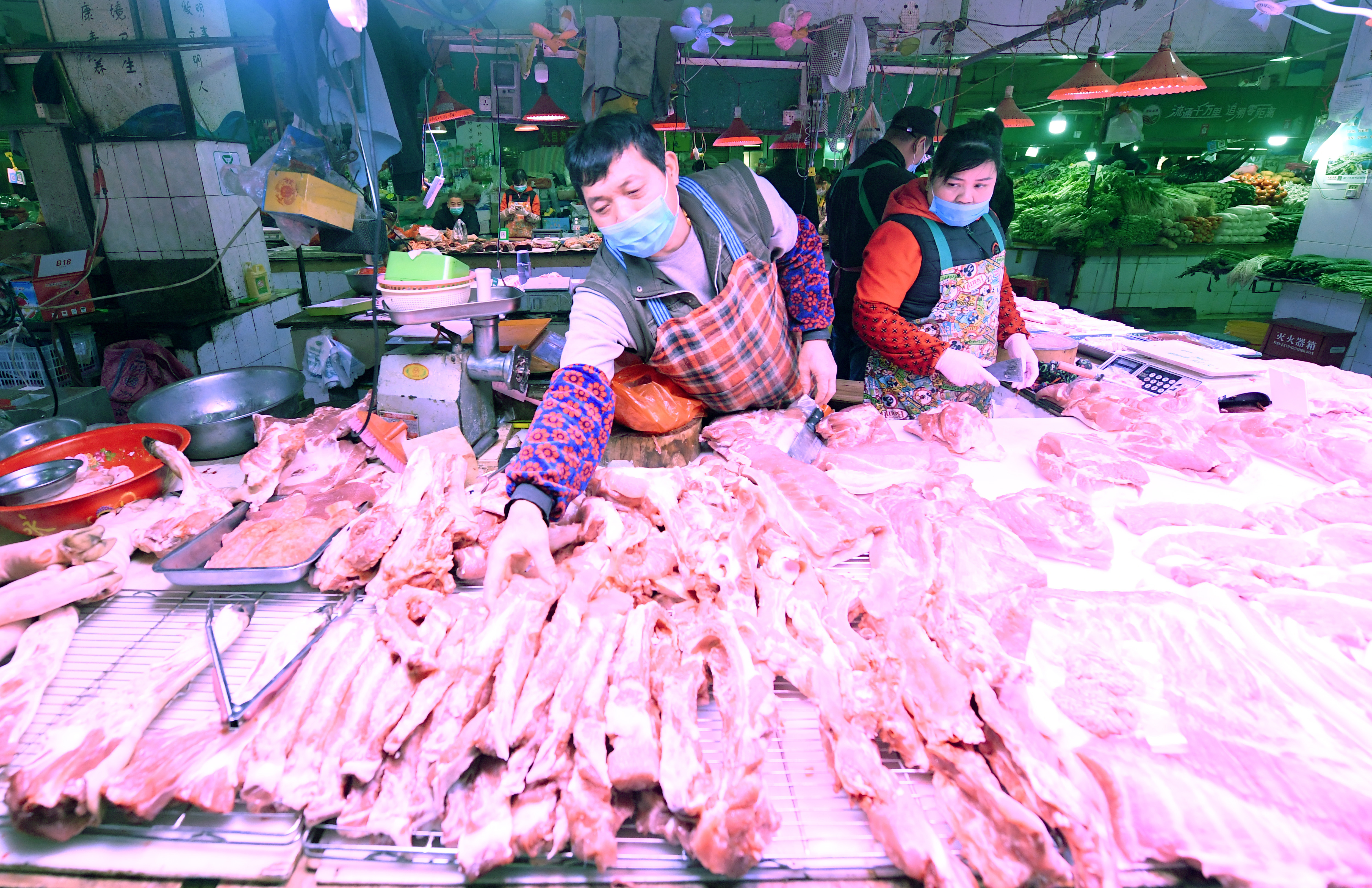 Vendors sell pork at a market in Nanning, south China's Guangxi Zhuang Autonomous Region, Jan. 30, 2020. (Xinhua/Lu Boan)