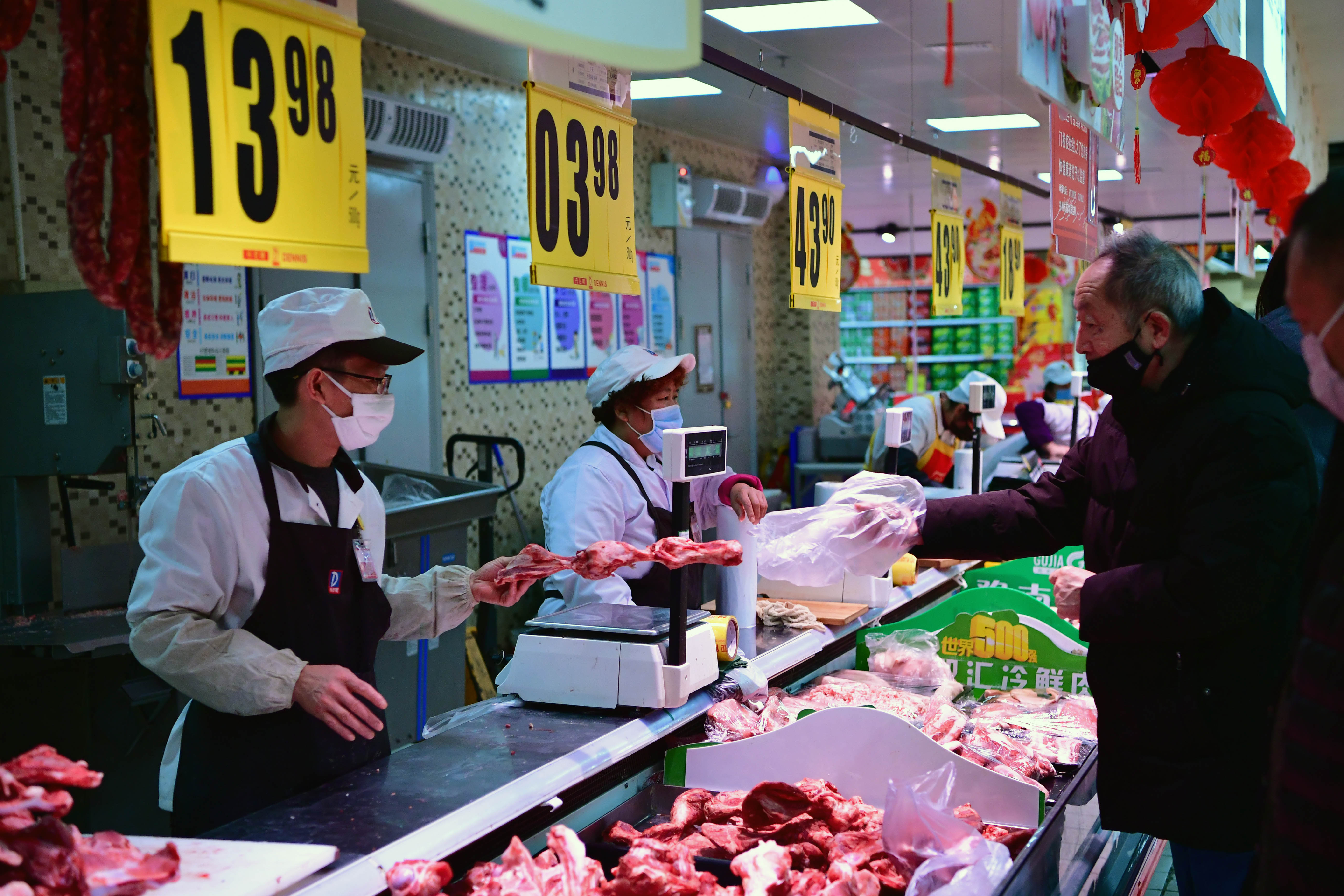 Citizens buy pork at a supermarket in Zhengzhou, central China's Henan Province, Jan. 30, 2020. (Xinhua/Feng Dapeng)