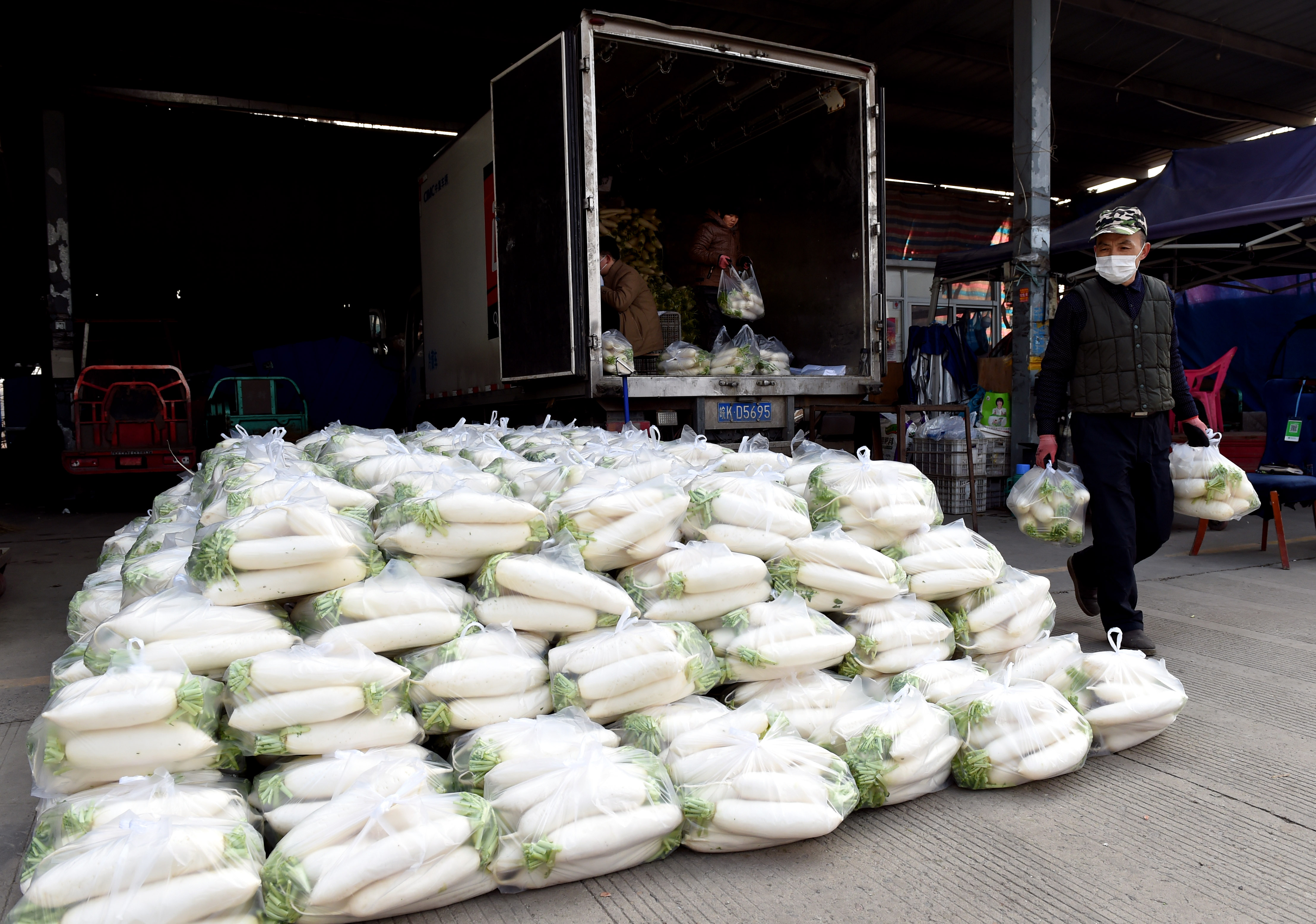 Sellers pack newly arrived turnips at a trading center in Hefei, east China's Anhui Province, Jan. 30, 2020. (Xinhua/Zhou Mu)
