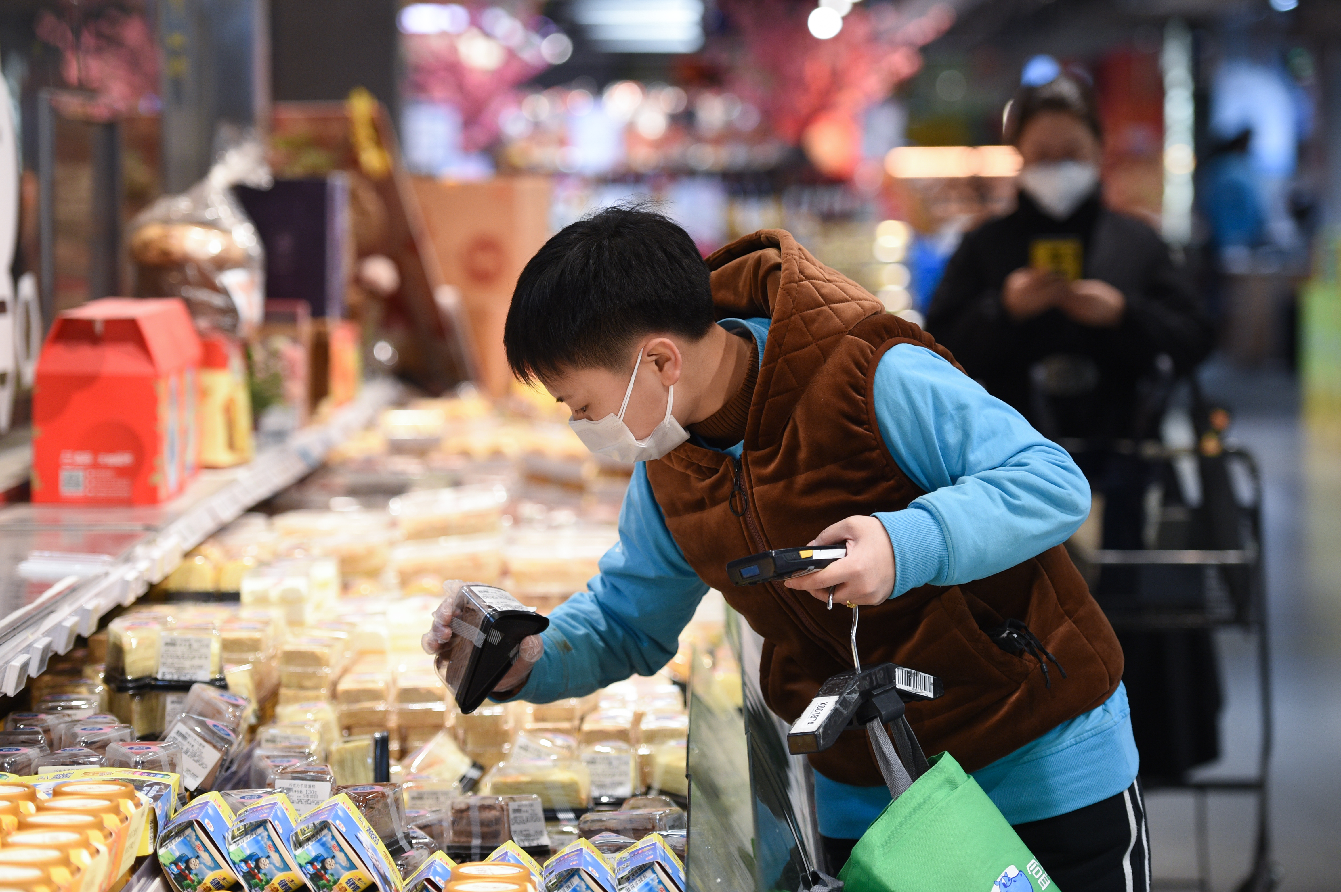 A staff member picks up goods for online orders at a store of Hema Fresh in Beijing, capital of China, Feb. 14, 2020. (Xinhua/Ju Huanzong)