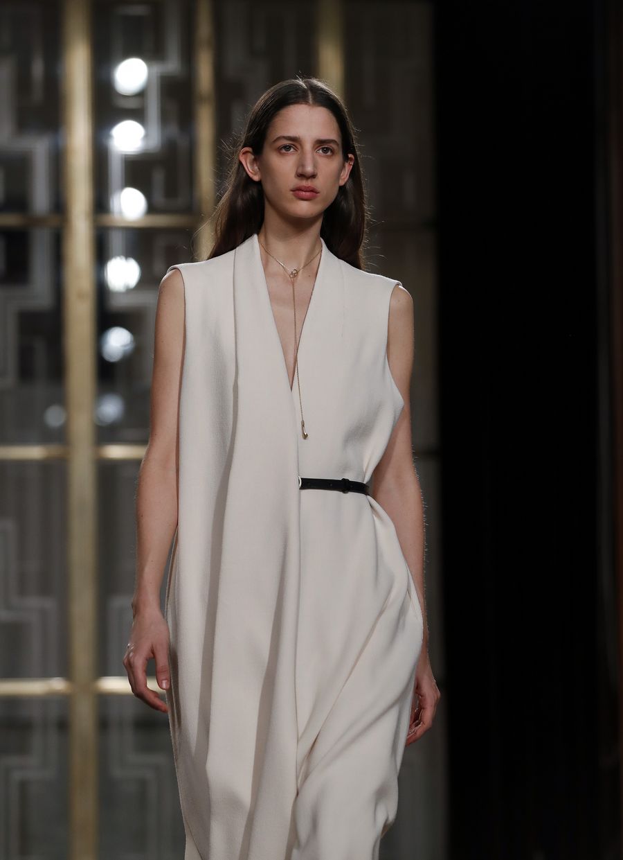 A model walks the runway at Petar Petrov catwalk show during the London Fashion Week at the Royal Institute of British Architects in London, Britain. (Xinhua/Han Yan)