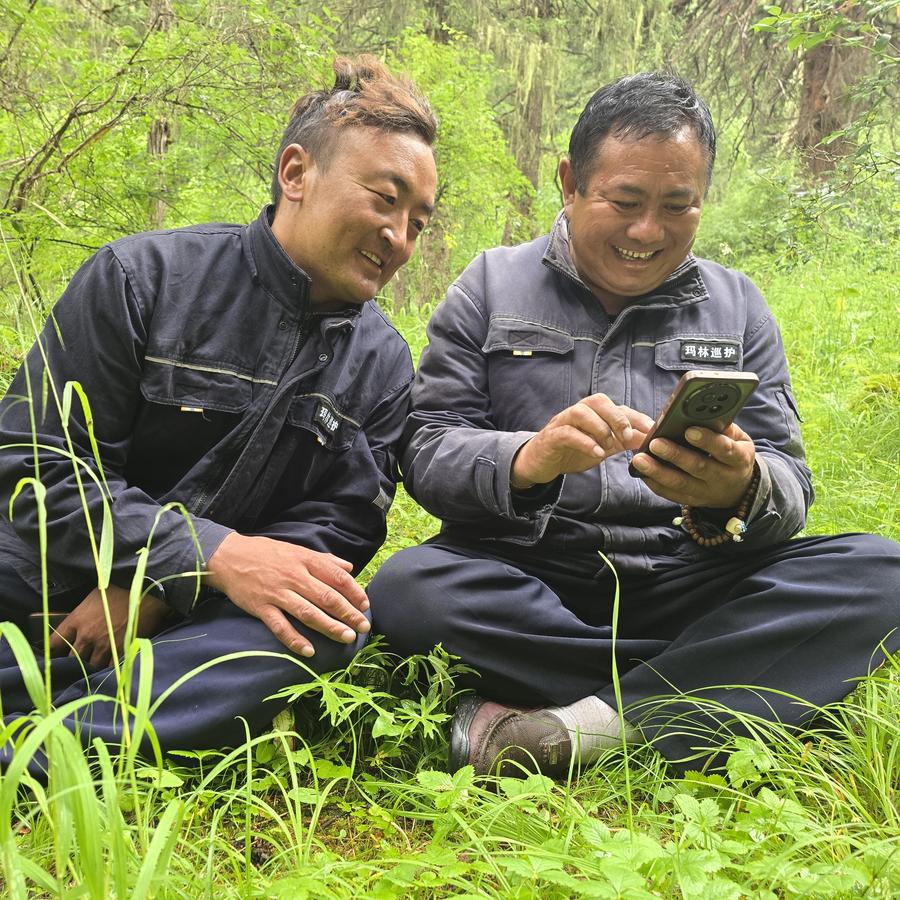 Rangers browse photos of wildlife taken on a mobile phone in the Markog River forest in Padma County, Golog Tibetan Autonomous Prefecture of northwest China's Qinghai Province, Aug. 7, 2025. (Xinhua/Li Linhai)