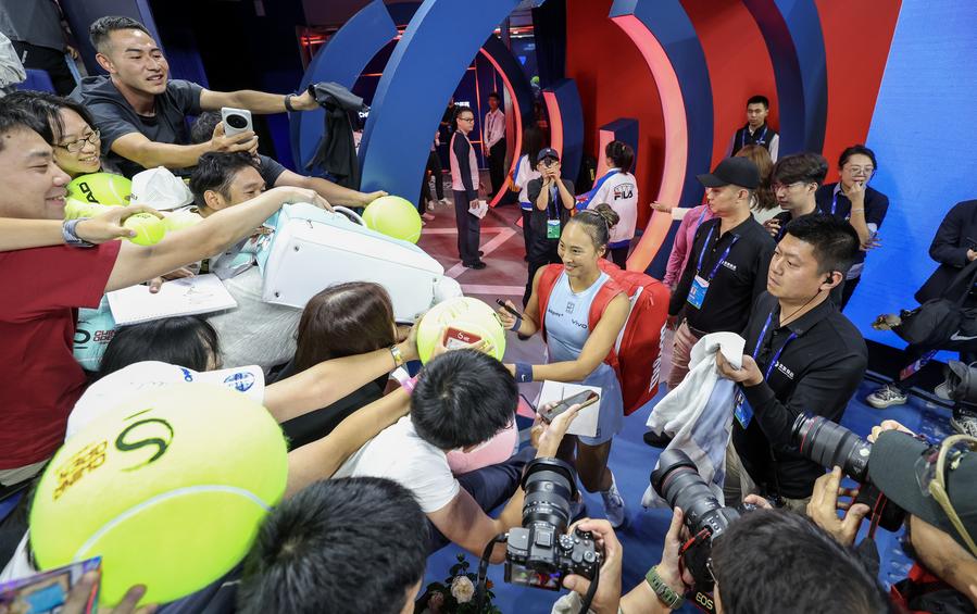 Zheng (C) signs an autograph after her women's singles second round match against Arango at the 2025 China Open. (Xinhua/Bai Xuefei)