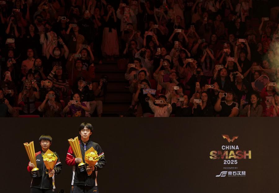 Winners Wang Chuqin (R)/Sun Yingsha pose for photos during the award ceremony for the mixed doubles event at the 2025 World Table Tennis (WTT) China Smash in Beijing on Oct. 3, 2025. (Xinhua/Ju Huanzong)