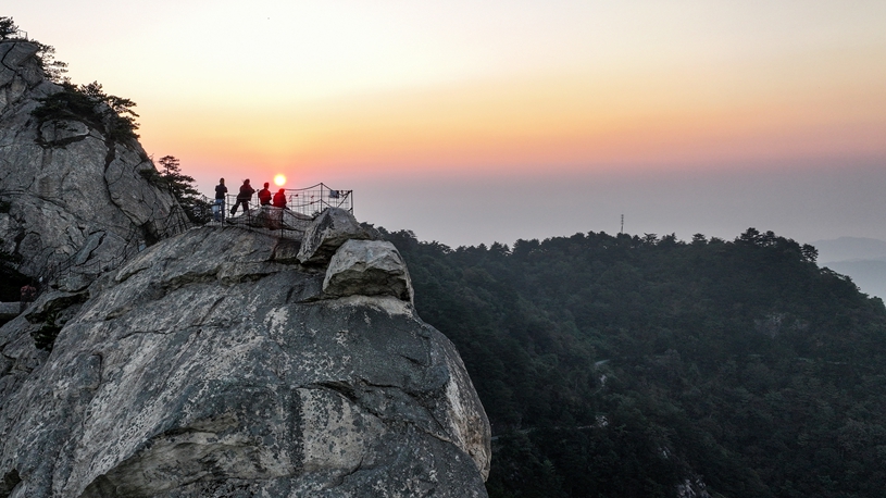 An aerial drone photo taken on Oct. 4, 2025 shows tourists enjoying sunrise scenery at a viewing platform in Tiantai County of Taizhou City, east China's Zhejiang Province. (Photo by Lin Lijun/Xinhua)