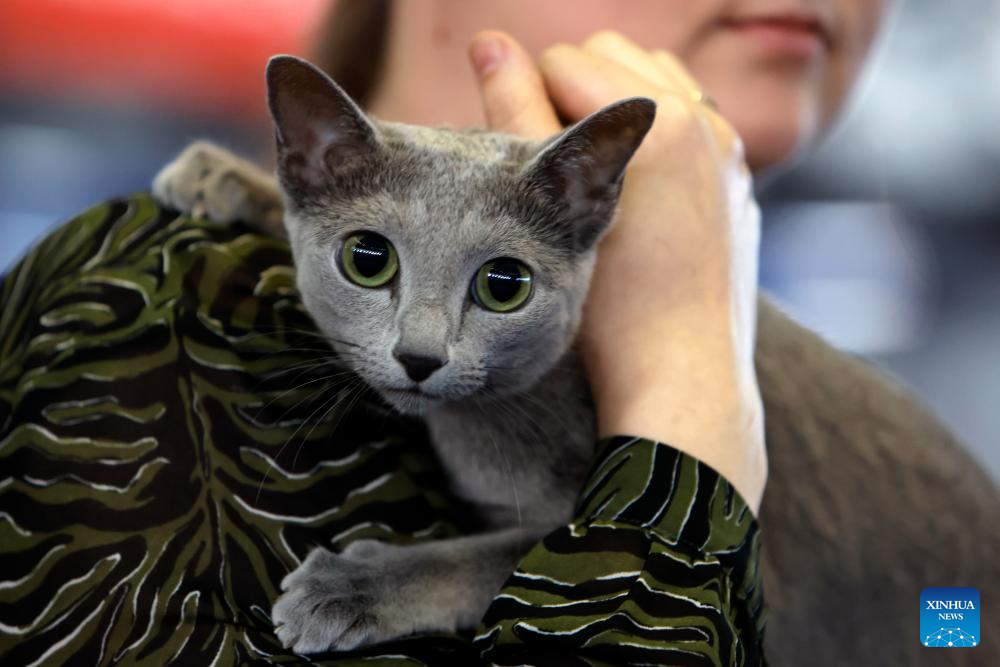 A Russian Blue cat is being judged during the Worldshow Romania 2025 feline championship at Romexpo in Bucharest, Romania, Oct. 25, 2025. More than 1,000 cats from more than 30 countries participated in the two-day feline beauty contest. (Photo by Cristian Cristel/Xinhua)