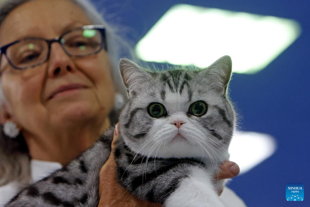 A British Shorthair cat is being judged during the Worldshow Romania 2025 feline championship at Romexpo in Bucharest, Romania, Oct. 25, 2025. More than 1,000 cats from more than 30 countries participated in the two-day feline beauty contest. (Photo by Cristian Cristel/Xinhua)
