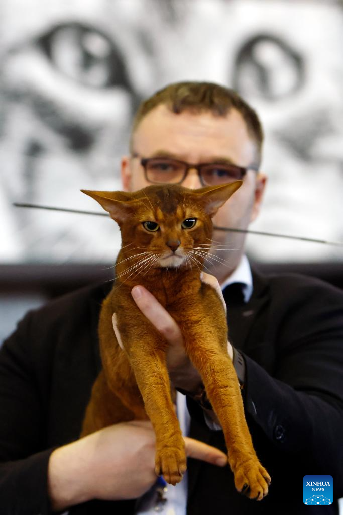 An Abyssinian cat is being judged during the Worldshow Romania 2025 feline championship at Romexpo in Bucharest, Romania, Oct. 25, 2025. More than 1,000 cats from more than 30 countries participated in the two-day feline beauty contest. (Photo by Cristian Cristel/Xinhua)