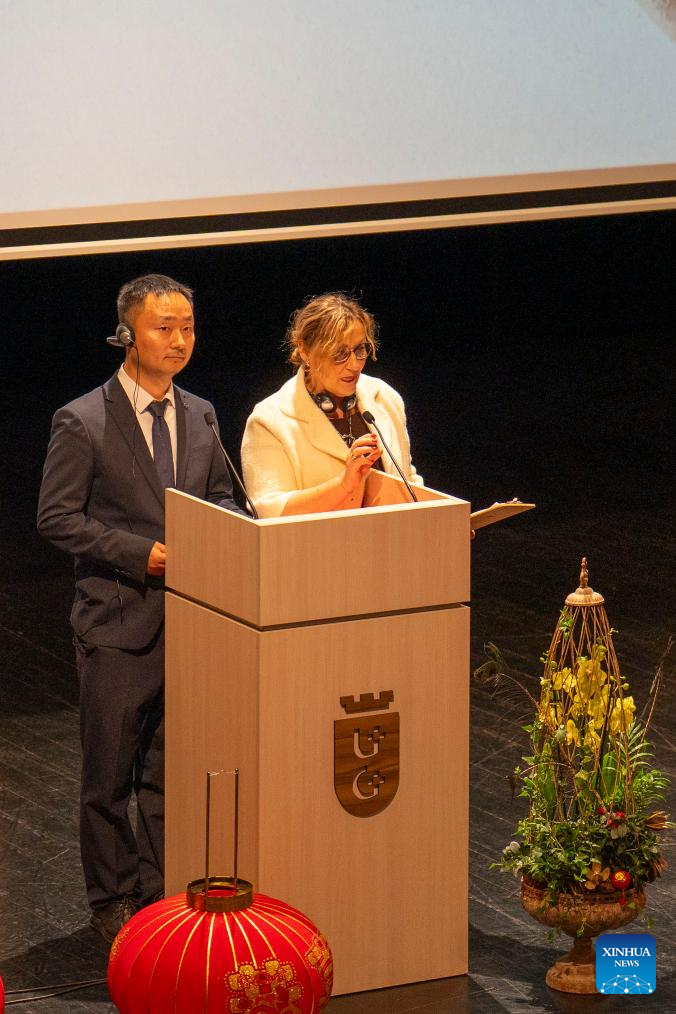 A Polish student presents traditional Chinese costumes at a ceremony marking the 10th anniversary of establishing the Confucius Institute in the University of Gdansk in Gdansk, Poland, on Oct. 26, 2025. The University of Gdansk in northern Poland has celebrated the 10th anniversary of establishing the Confucius Institute with a ceremony attended by more than 400 participants, including officials, educators, students, and local residents. Poland now has four Confucius Institutes and one independent Confucius Classroom, making it one of the Central and Eastern European countries with the largest number of such institutions. (Xinhua/Xia Yuanyi)