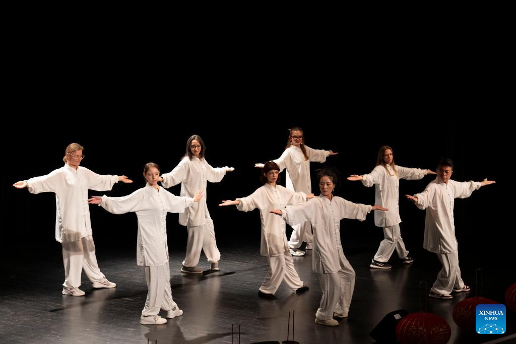 Teachers and students stage a performance featuring the Tai Chi martial arts at a ceremony marking the 10th anniversary of establishing the Confucius Institute in the University of Gdansk in Gdansk, Poland, on Oct. 26, 2025. The University of Gdansk in northern Poland has celebrated the 10th anniversary of establishing the Confucius Institute with a ceremony attended by more than 400 participants, including officials, educators, students, and local residents.