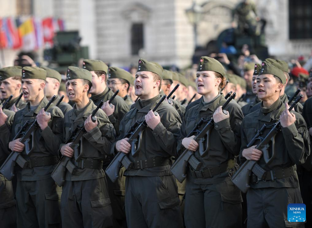 Austrian army recruits participate in the National Day celebrations in Vienna, Austria, on Oct. 26, 2025. (Xinhua/He Canling)