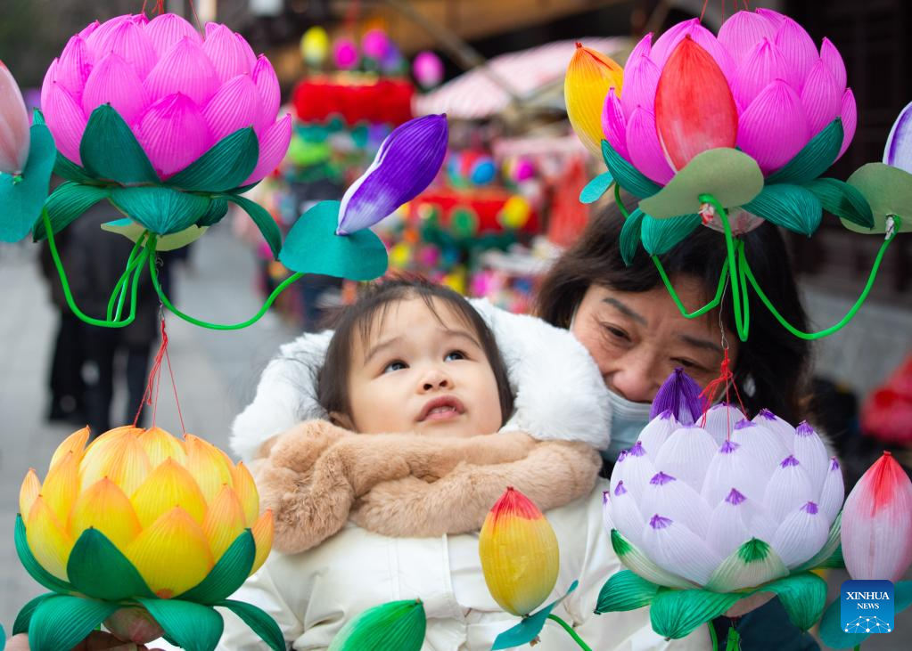 People visit Xinanli historical culture blocks in Nanjing, east China's Jiangsu Province, Feb. 13, 2022. Various events are held across China to celebrate the upcoming Lantern Festival. (Photo by Li Wenbao/Xinhua)