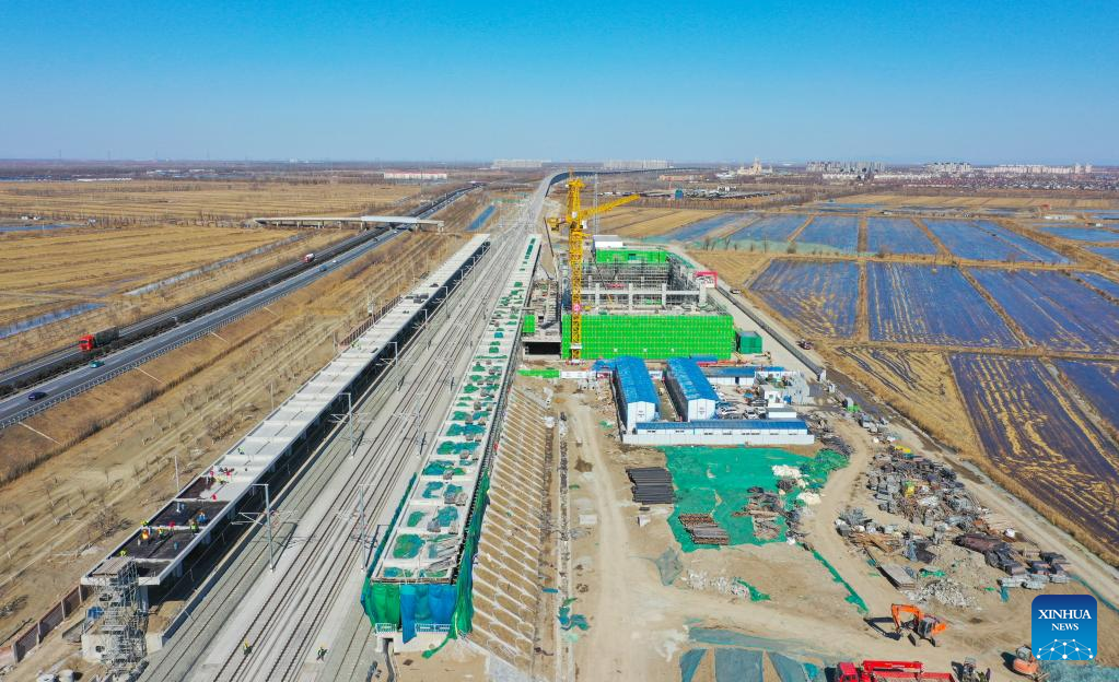 Aerial photo shows Zhouliang Station of a railway linking Beijing with the Binhai New Area of Tianjin in north China's Tianjin, Feb. 26, 2022. With a length of about 172 kilometers and a designed speed of 350 kilometers per hour, the second intercity express railway linking Beijing with the Binhai New Area of Tianjin is expected to cut travel time between the two areas to 57 minutes. (Xinhua/Sun Fanyue)