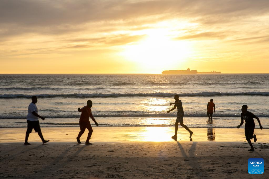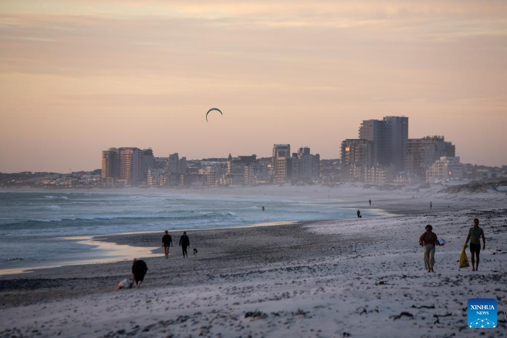 People walk on Sunset Beach at sunset in Cape Town, South Africa, on March 26, 2022. (Xinhua/Lyu Tianran)