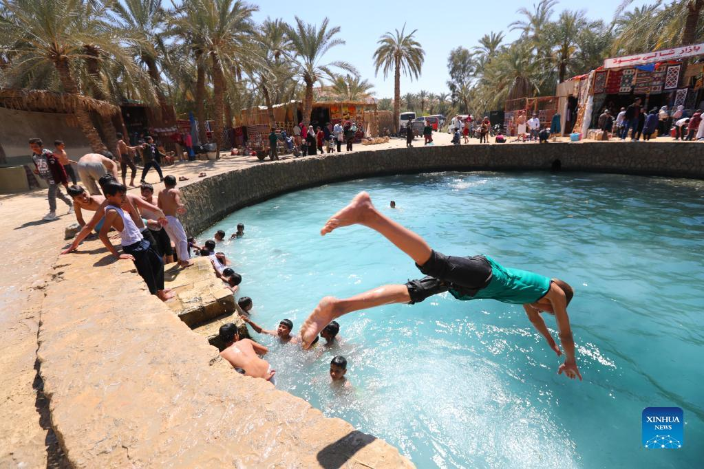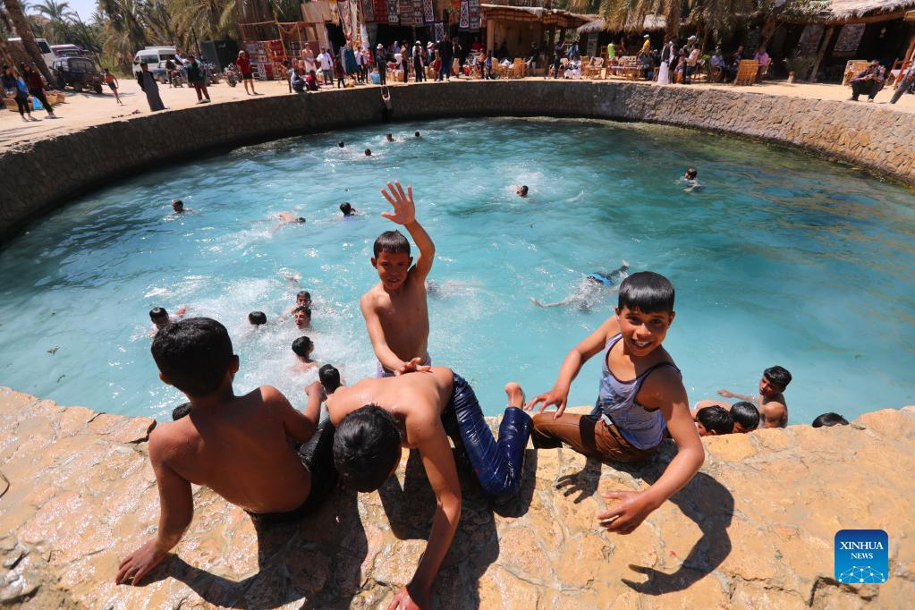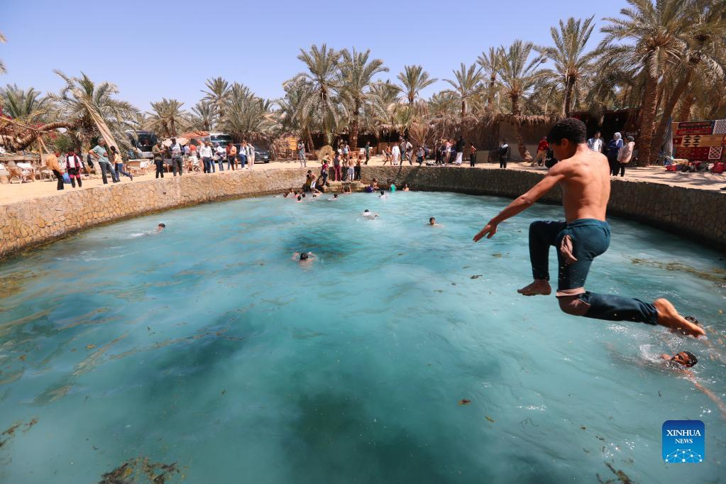 Boys play in the Cleopatra's Pool at Siwa Oasis in Matrouh Governorate, Egypt, on March 26, 2022. Siwa Oasis lies in Egypt's western desert and there are some 2,000 natural hot springs in which locals love taking a bath. (Xinhua/Sui Xiankai)