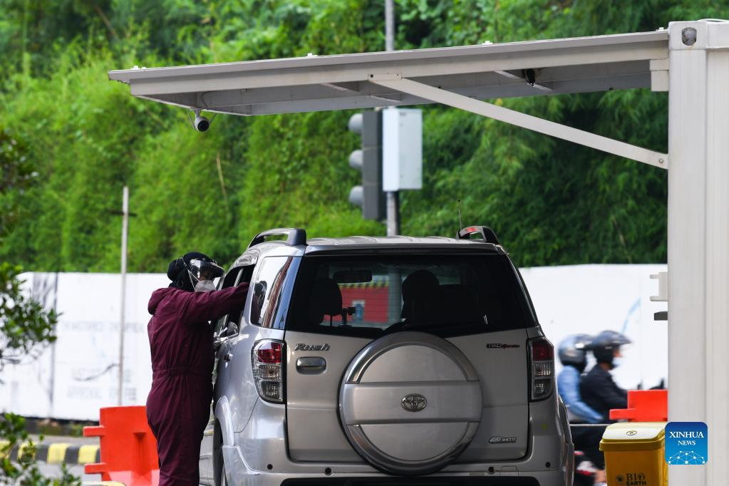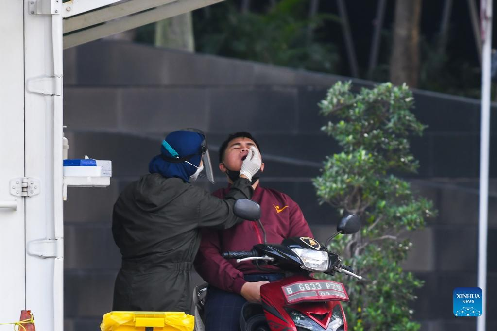 A health worker conducts COVID-19 antigen test for a person at a drive-thru COVID-19 antigen test station in Jakarta, Indonesia, March 27, 2022. Indonesia has registered more than 6 million cases of COVID-19 since the first case was confirmed in the country in March 2020. On Monday, the Health Ministry reported that the coronavirus cases across the archipelago rose by 2,798 within the past 24 hours to 6,001,751 with the death toll adding by 104 to 154,774. (Xinhua/Xu Qin)
