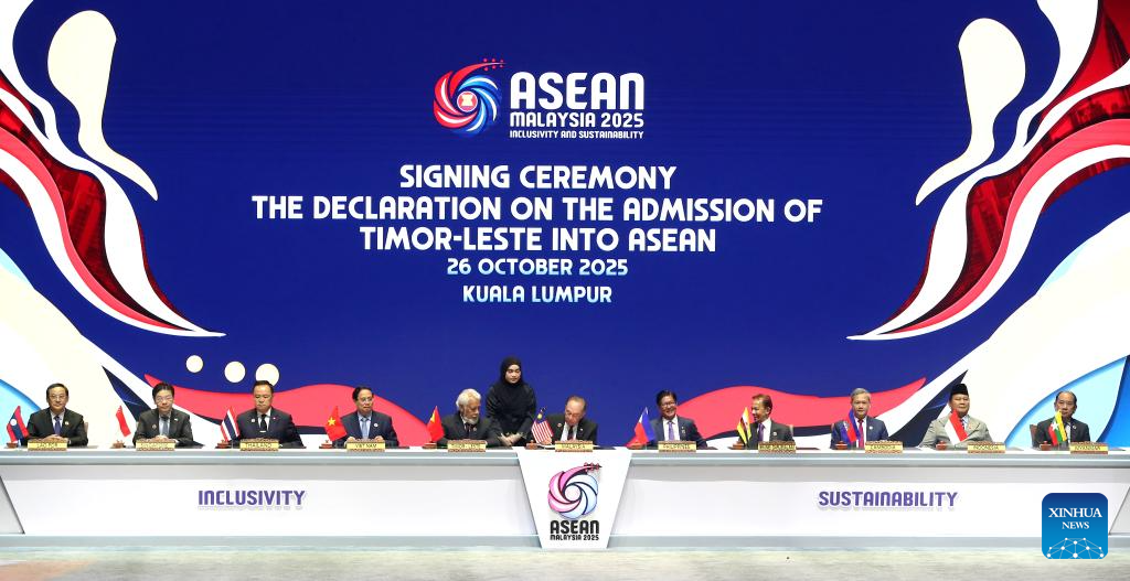 Lao Prime Minister Sonexay Siphandone, Singaporean Prime Minister Lawrence Wong, Thai Prime Minister Anutin Charnvirakul, Vietnamese Prime Minister Pham Minh Chinh, Prime Minister of Timor-Leste Xanana Gusmao, Malaysian Prime Minister Anwar Ibrahim, Philippine President Ferdinand Romualdez Marcos, Sultan of Brunei Haji Hassanal Bolkiah, Cambodian Prime Minister Hun Manet, Indonesian President Prabowo Subianto, and a representative from Myanmar (L to R) are present at the signing of the Declaration on the Admission of Timor-Leste into the Association of Southeast Asian Nations (ASEAN) in Kuala Lumpur, Malaysia, Oct. 26, 2025.