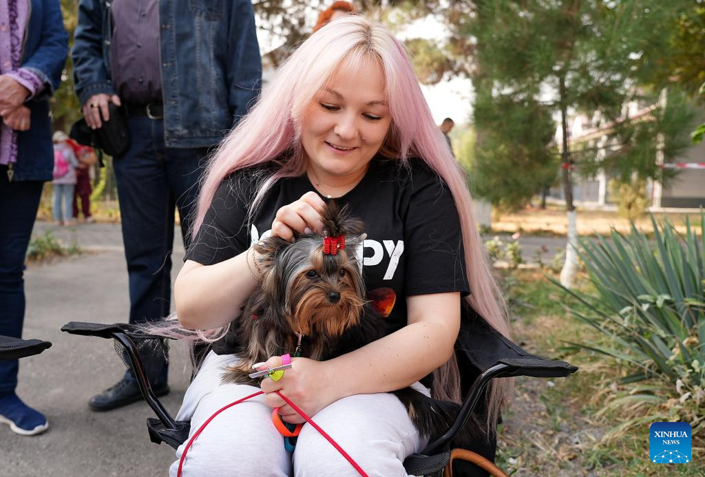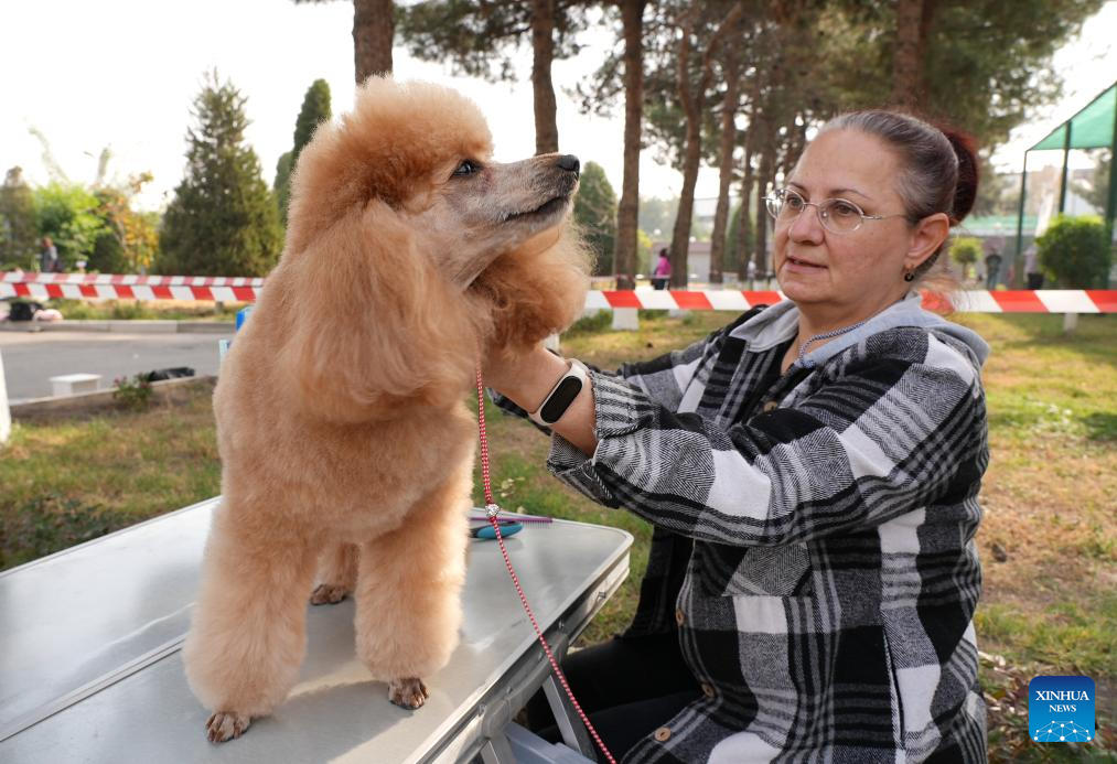 A pet dog is seen during a dog festival in Tashkent, Uzbekistan, Oct. 26, 2025. The event brought together a wide variety of dog breeds alongside professionally trained working dogs, as local visitors enthusiastically marveled at dog performances presented by experts. (Photo by Zafar Khalilov/Xinhua)