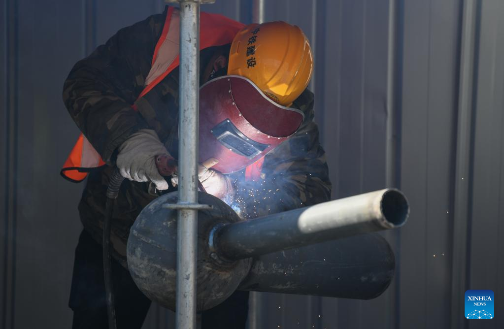 A man works at Zhouliang Station of a railway linking Beijing with the Binhai New Area of Tianjin in north China's Tianjin, Feb. 26, 2022. With a length of about 172 kilometers and a designed speed of 350 kilometers per hour, the second intercity express railway linking Beijing with the Binhai New Area of Tianjin is expected to cut travel time between the two areas to 57 minutes. (Xinhua/Sun Fanyue)