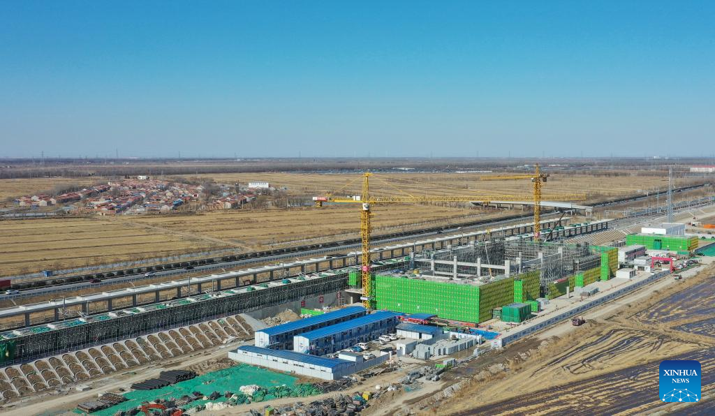 Aerial photo shows Zhouliang Station of a railway linking Beijing with the Binhai New Area of Tianjin in north China's Tianjin, Feb. 26, 2022. With a length of about 172 kilometers and a designed speed of 350 kilometers per hour, the second intercity express railway linking Beijing with the Binhai New Area of Tianjin is expected to cut travel time between the two areas to 57 minutes. (Xinhua/Sun Fanyue)