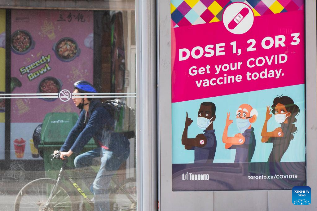 A man bicycles past a poster reminding people to get vaccinated against COVID-19 in Toronto, Canada, on March 21, 2022. Canada confirmed 2,698 new COVID-19 cases Monday evening, elevating its national caseload to 3,404,697, CTV reported. (Photo by Zou Zheng/Xinhua)