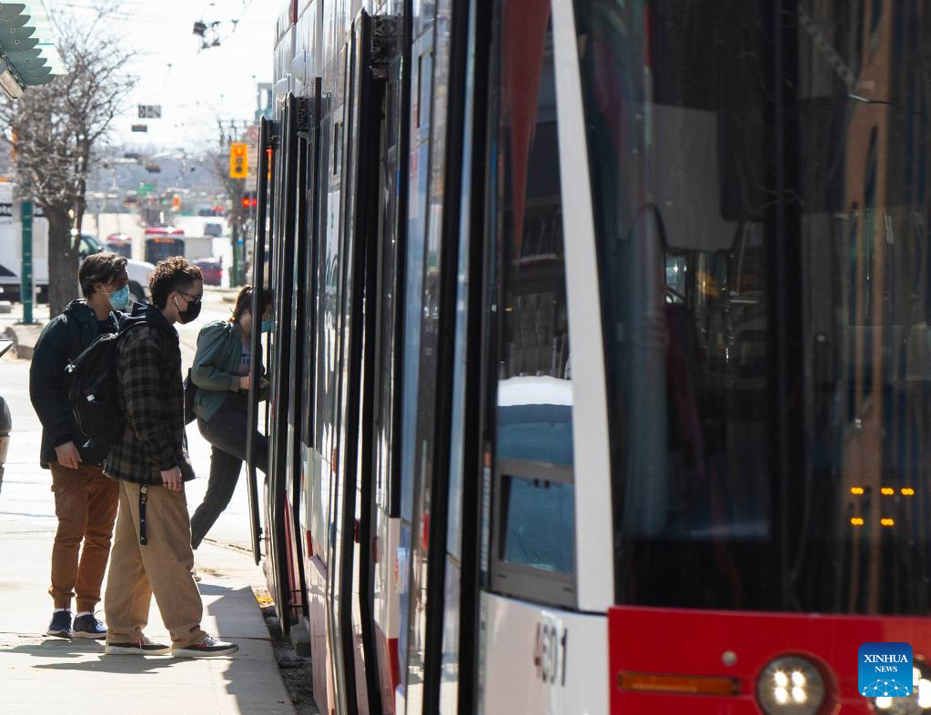 People wearing face masks line up to get on a streetcar in Toronto, Canada, on March 21, 2022. Canada confirmed 2,698 new COVID-19 cases Monday evening, elevating its national caseload to 3,404,697, CTV reported. (Photo by Zou Zheng/Xinhua)