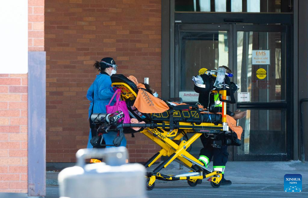 A patient is wheeled to a hospital in Toronto, Canada, on March 21, 2022. Canada confirmed 2,698 new COVID-19 cases Monday evening, elevating its national caseload to 3,404,697, CTV reported. (Photo by Zou Zheng/Xinhua)