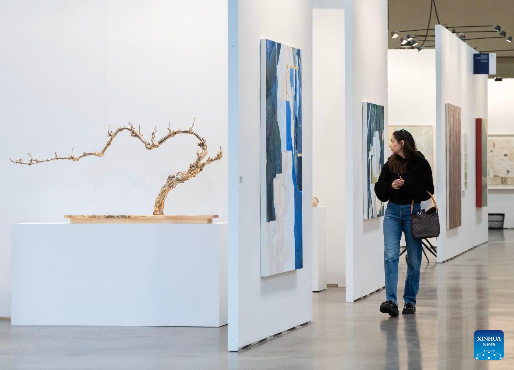 A woman visits the Art Toronto 2025 in Toronto, Canada, Oct. 23, 2025. Featuring over 100 international galleries, installations, project spaces and more, the art fair is held here from Oct. 23 to 26. (Photo by Zou Zheng/Xinhua)