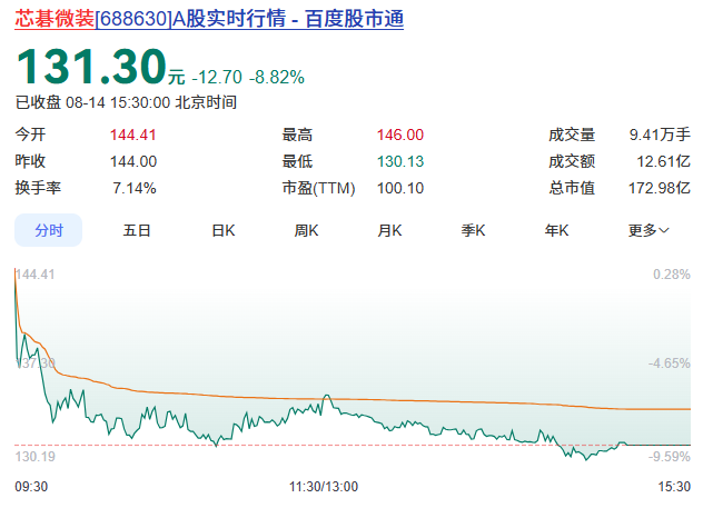 另值得关注的是,8月14日二级市场交易中,芯碁微装股价也出现波动。截至8月14日收盘,芯碁微装股价下跌8.82%,收于每股131.30元/股,总市值为172.98亿元。
