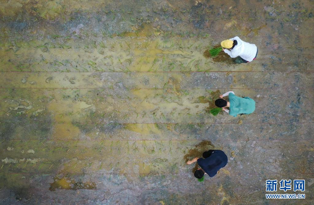 研究人員在廣州增城華南農業大學試驗田插種嫦娥五號搭載的太空稻秧苗(2021年3月29日攝,無人機照片)。共計40克的“天稻”于2020年11月搭乘嫦娥五號登月,歷時約23天、76萬公里的“環月旅行”返回地球。