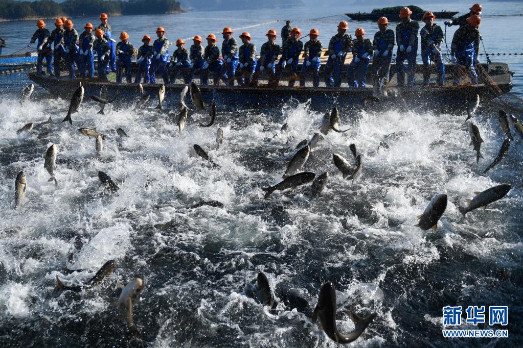 捕撈隊(duì)員在千島湖進(jìn)行巨網(wǎng)捕魚(2018年11月28日攝)。近年來(lái),千島湖以漁業(yè)為基礎(chǔ),建立了集“養(yǎng)殖、管護(hù)、捕撈、銷售、加工、烹飪、旅游、文創(chuàng)”為一體的完整產(chǎn)業(yè)鏈,獲得經(jīng)濟(jì)效益和生態(tài)效益的雙豐收。