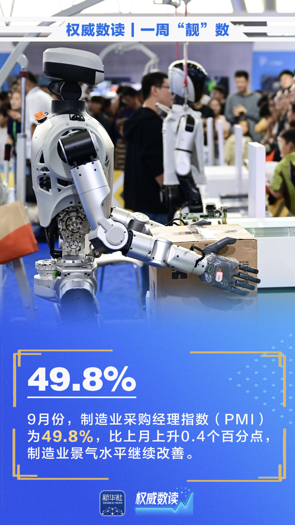 自9月30日以来全国铁路连续4天日发送旅客超1800万人次,运输安全平稳有序;9月份,制造业采购经理指数(PMI)为49.8%,比上月上升0.4个百分点;2024年我国居民数字消费规模达23.8万亿元,相当于当年居民消费的44.2%……本周,这些数据最值得关注!