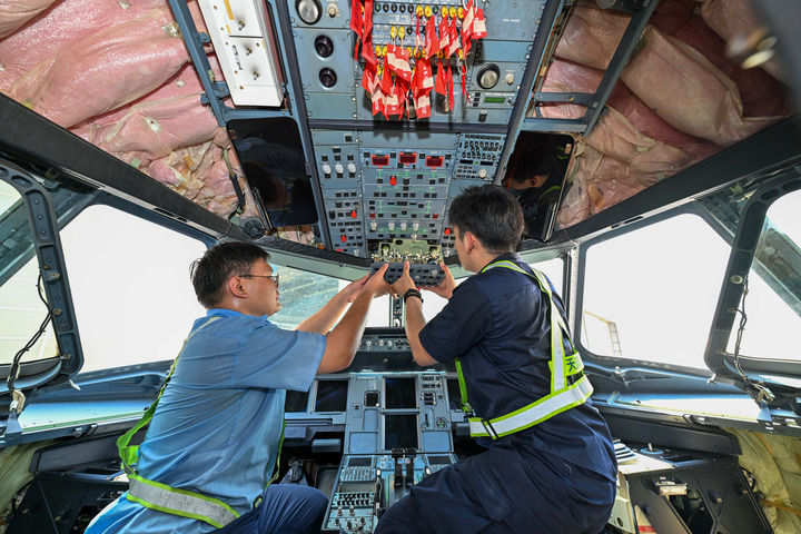 6月18日,在天津自由贸易试验区天津机场片区内的天津海特飞机工程有限公司,工作人员在停机坪对飞机进行保税维修。新华社记者 孙凡越 摄