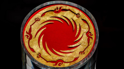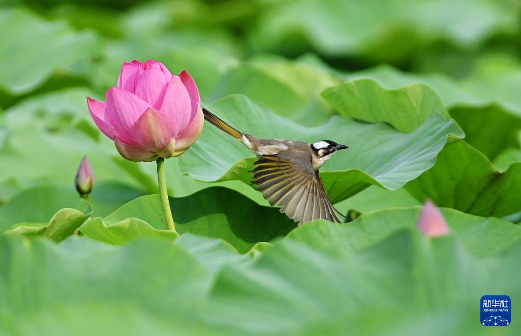 在山东省滕州市龙泉广场荷花池,一只小鸟在花间飞舞。