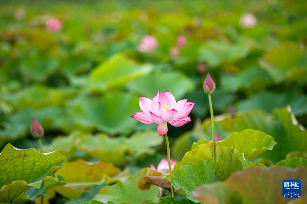 游人在广西南宁市花卉公园的荷塘观赏荷花。